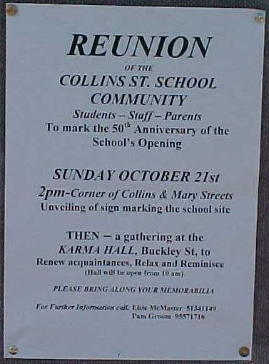 The Collins Street School community celebrated on Sunday October 21 – 2001 to mark the 50th anniversary of the school’s opening. A sign marking the schools site was unveiled at the ceremony. Many ex students and teachers attended the ceremony to mark another important time in the history of Morwell.